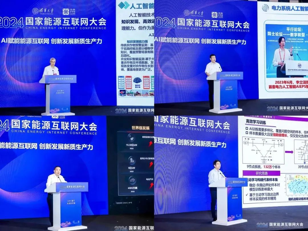 在大会主题报告环节中,国家电网国家电力调度控制中心副主任李丹,南方电网新型电力系统(北京)研究院执行董事、院长李鹏,华为公司副总裁、电力数字化军团CEO孙福友,清华大学电机系长聘教授、副主任陆超分别做了《AI赋能新型电力系统调度运行》《电力系统人工智能基础模型的研究与展望》《算三本账,加速能源行业数字化、智能化》《电力系统稳定分析控制中人工智能的应用与挑战》的主题报告。各位专家齐聚一堂,共同探讨“双碳”目标背景下我国能源互联网产业和技术创新发展大计。